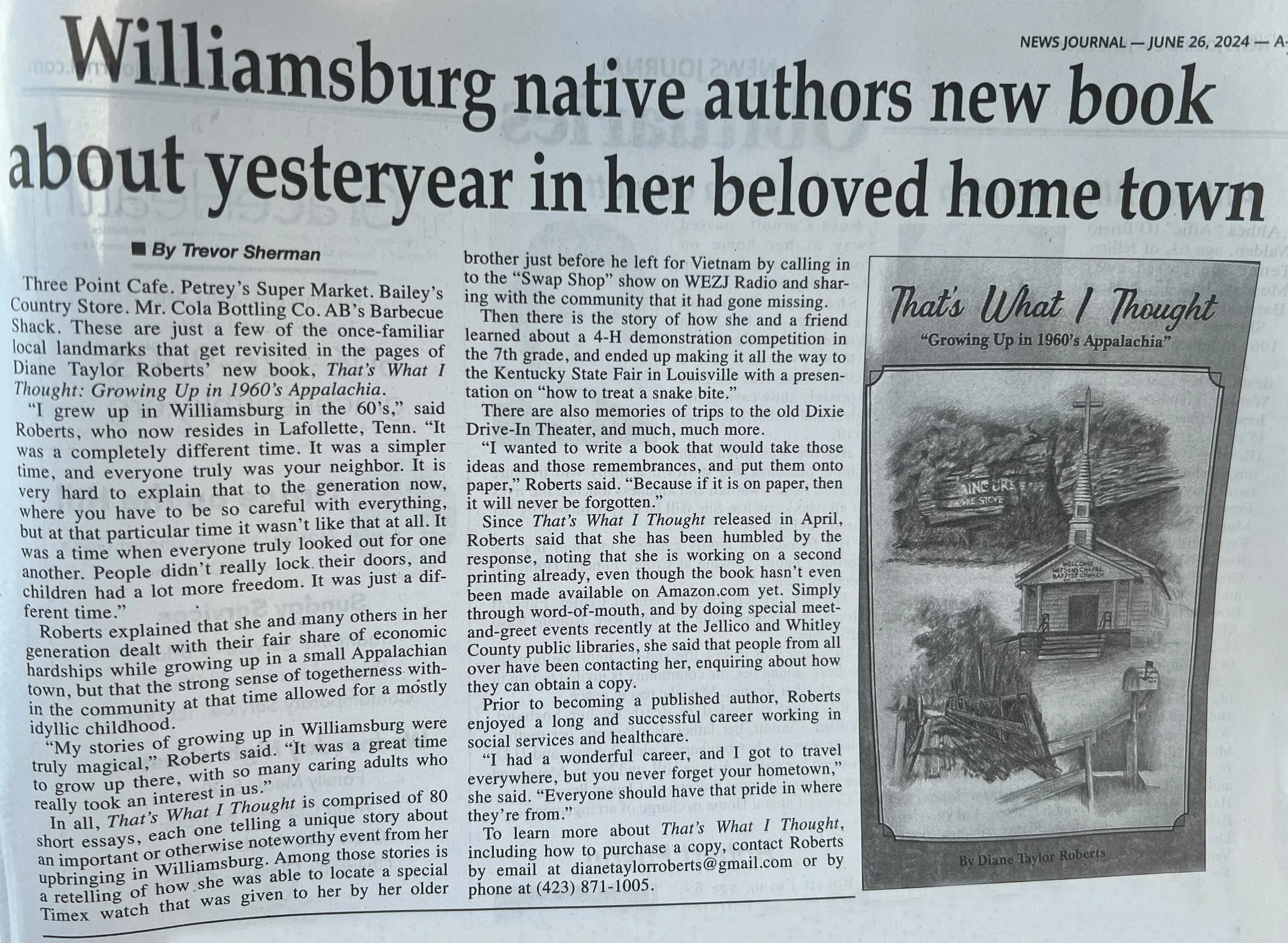 “I was so excited to purchase Diane Taylor Roberts’ book yesterday. So many memories of our local way of life during a different time period. Best of luck on this venture of love, Diane. May you have much success.”